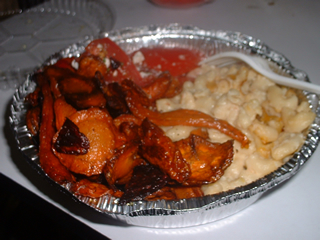 どうも3種類選べって言ってるらしく、マカロニグラタンと、トマトサラダと、なんかよくわかんないけど揚げ物(手羽先かと思ってたら、ニンジンとか野菜でした)をチョイス。
