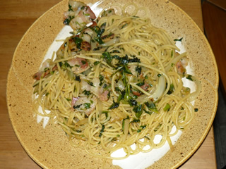 さて、今日のお昼は早速パスタ。機内食で余っていたバターがあったので、それと醤油を使って和風パスタに。