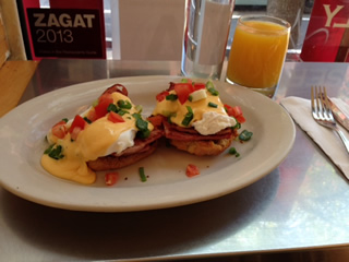 本日はエッグベネディクトとオレンジジュースにしてみました。意外にも長ねぎが乗っかってました。