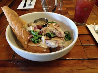 せっかくなので、今日のご飯は冒険してみました。メニューの解読に苦労しつつ『mangalitsa pork sausage Baguette Leek Gravy Mustard』と、ソフトドリンクの中から『Bluestone - Virgin Bloody Mary,Horseradish, Thai Bitters』というのを注文。