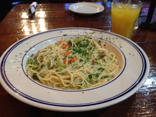 ここはパエリャがおいしかったよなーと思いつつ、でも今回は食費節約しないともたなそうなので、リングイネとオレンジジュースを注文。