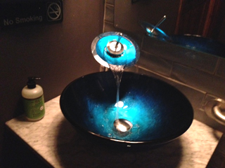 余談ですが、右の写真はお店のトイレの洗面台です。蛇口が変わってるし色も綺麗だったので思わず写真撮っちゃいました。